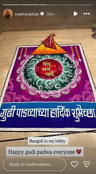 For Eid, Hina got mehendi on her hands and shared a picture of it, tagging her husband Rocky Jaiswal and asking, "Did you like it?" The actress also uploaded a picture of the rangoli in her lobby, wishing her fans a Happy Gudi Padwa.