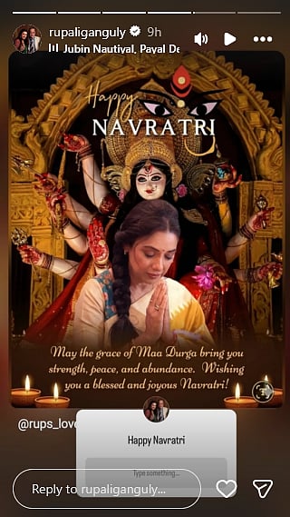 Anupamaa actress Rupali Ganguly wished everyone a Happy Navratri, writing, "May the grace of Maa Durga bring you strength, peace, and abundance. Wishing you a blessed and joyous Navratri!"