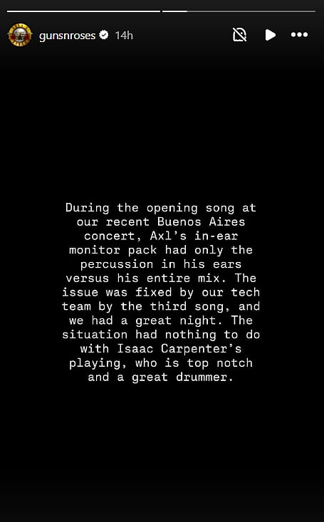 A statement issued on the band's Instagram Story read, "During the opening song at our recent Buenos Aires concert, Axl's in-ear monitor pack had only the percussion in his ears versus the entire mix. The issue was fixed by our tech by the third song, and we had a great night. The situation had nothing to do with Isaac Carpenter's playing, who is top notch and a great player".