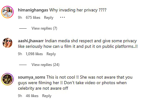 "What the hell is wrong with you?? Have some shame," a user wrote, while another commented, "This is not cool !! She was not aware that you guys were filming her !! Don't take video or photos when celebrity are not aware off".