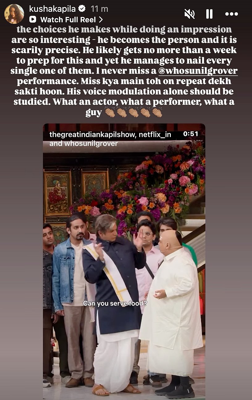 On Sunday, Kusha took to her Instagram story to re-share the video of Sunil mimicking Kader. She praised his performance, stating that he always nails it and that she never misses watching his act.