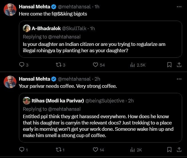 Responding to the tweet Hansal wrote, "Your parivar needs coffee. Very strong coffee."