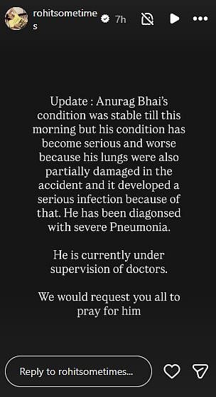 Rohit shared, "Anurag Bhai's condition was stable till this morning but his condition has become serious and worse because his lungs were also partially damaged in the accident and it developed a serious infection because of that (sic)."