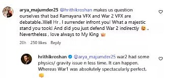 A fan asked, "Hrithik Roshan makes us question ourselves that bad Ramayana VFX and War 2 VFX are debatable… Well Hr, I surrender infront of you! What a majestic stand you took! And did you just defend War 2 indirectly... Nevertheless, love always to My King."
