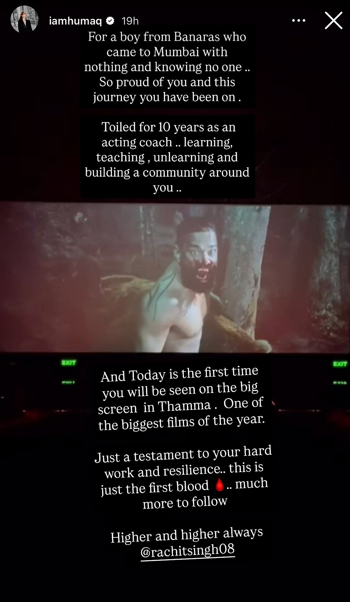Taking to her Instagram story on Tuesday, Huma penned a heartfelt note for Rachit and wrote, "For a boy from Banaras who came to Mumbai with nothing and knowing no one... So proud of you and this journey you have been on. Toiled for 10 years as an acting coach...learning, teaching, unlearning and building a community around you...