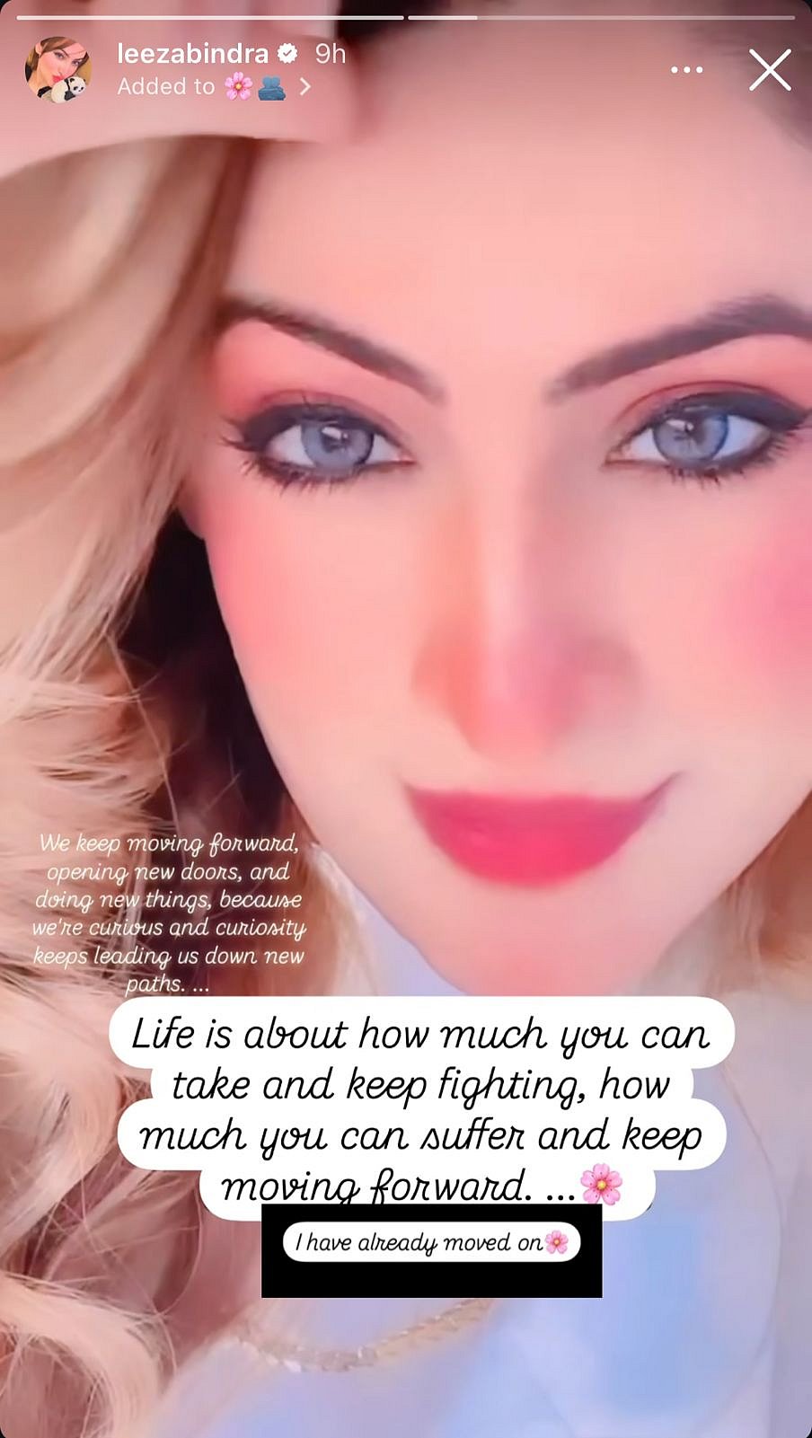In the next slide, the actress writes, ''We keep moving forward, opening new doors, and doing new things, because we're curious and curiosity keeps leading us down new paths. Life is about how much you can take and keep fighting, how much you can suffer and keep moving forward. I have already moved on.''