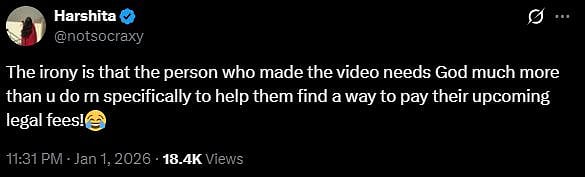 Another X user wrote, "The irony is that the person who made the video needs God much more than u do rn specifically to help them find a way to pay their upcoming legal fees! (sic)."