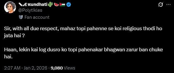 Reacting to Akhtar's tweet, a netizen wrote, "Sir, with all due respect, mahaz topi pahenne se koi religious thodi ho jata hai ? Haan, lekin kai log dusro ko topi pahenakar bhagwan zarur ban chuke hai (sic)."