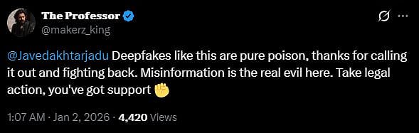 One more netizen tweeted, "@Javedakhtarjadu Deepfakes like this are pure poison, thanks for calling it out and fighting back. Misinformation is the real evil here. Take legal action, you've got support (sic)." Check out the tweets below...
