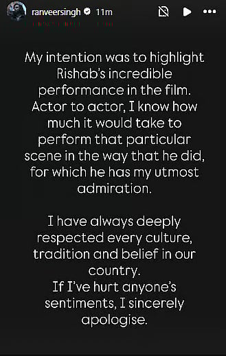 Ranveer had faced a lot of backlash for his statement at IFFI. But, the actor later apolgised for huring religious sentiments of the people. He had shared on his Instagram story, "My intention was to highlight Rishabh's incredible performance in the film. Actor to actor, I know how much it would take to perform that particular scene in the way that he did, for which he has my utmost admiration."