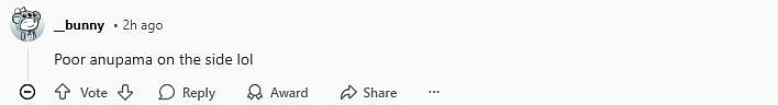 A Reddit user wrote, "He always appreciates good work but doesn't learn anything from that (sic)." Another netizen commented, "Poor anupama on the side lol (sic)."