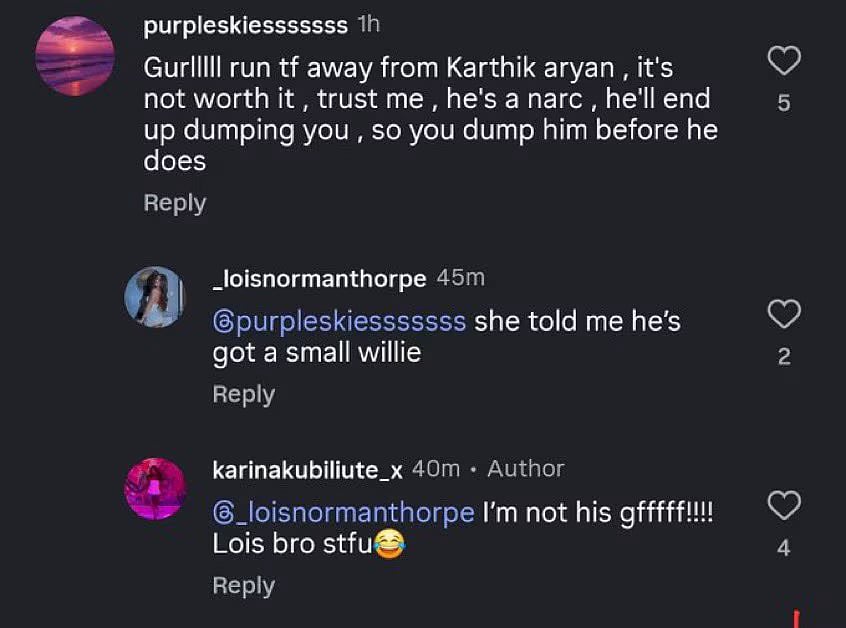 While neither Kartik nor Karina initially addressed the rumours, the speculation continued to snowball online. However, a screenshot that has now gone viral suggests Karina has denied the claims. In the picture, she is seen commenting under a post, stating, “I’m not his gffff!!!” The post in question included several unverified claims about Kartik, none of which have been confirmed by credible sources.