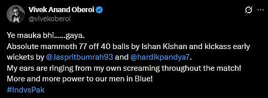 Vivek Oberoi wrote, "Ye mauka bhi..….gaya. Absolute mammoth 77 off 40 balls by Ishan Kishan and kickass early wickets by @Jaspritbumrah93 and @hardikpandya7 . My ears are ringing from my own screaming throughout the match! More and more power to our men in Blue! #IndvsPak (sic)."