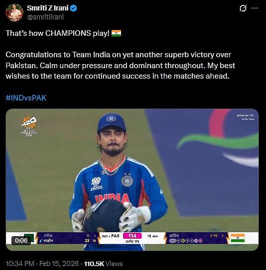 Kyunki Saas Bhi Kabhi Bahu Thi actress Smriti Irani posted on X, "That’s how CHAMPIONS play! 🇮🇳 Congratulations to Team India on yet another superb victory over Pakistan. Calm under pressure and dominant throughout. My best wishes to the team for continued success in the matches ahead. #INDvsPAK (sic)."