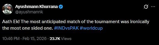Ayushmann Khurrana tweeted, "Aath Ek! The most anticipated match of the tournament was ironically the most one sided one. #INDvsPAK #worldcup (sic)."