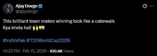 Ajay Devgn tweeted, "This brilliant team makes winning look like a cakewalk Kya khela hai! 🙌🇮🇳 #IndVsPak #T20WorldCup2026 (sic)."