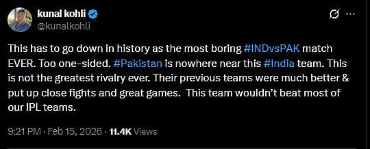 Filmmaker Kunal Kohli tweeted, "This has to go down in history as the most boring #INDvsPAK match EVER. Too one-sided. #Pakistan is nowhere near this #India team. This is not the greatest rivalry ever. Their previous teams were much better & put up close fights and great games. This team wouldn’t beat most of our IPL teams. (sic)."