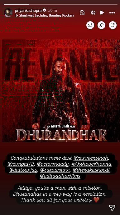 On Wednesday (April 1), Priyanka took to her Instagram story to share a poster of the film and wrote, "Congratulations mere dost," and tagged Ranveer, Arjun Rampal, Sanjay Dutt, R Madhavan, Akshaye Khanna, Sara Arjun and Rakesh Bedi.