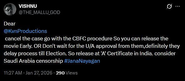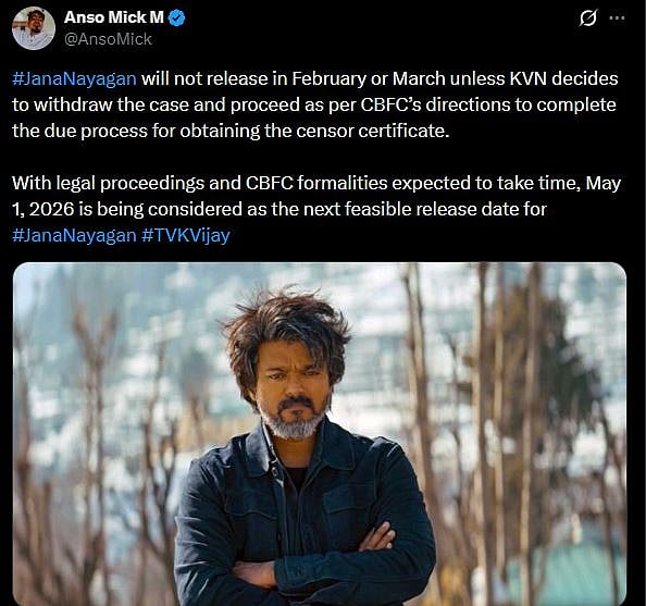 One more netizen tweeted, "#JanaNayagan will not release in February or March unless KVN decides to withdraw the case and proceed as per CBFC’s directions to complete the due process for obtaining the censor certificate. With legal proceedings and CBFC formalities expected to take time, May 1, 2026 is being considered as the next feasible release date for (sic)." Check out the tweets below...
