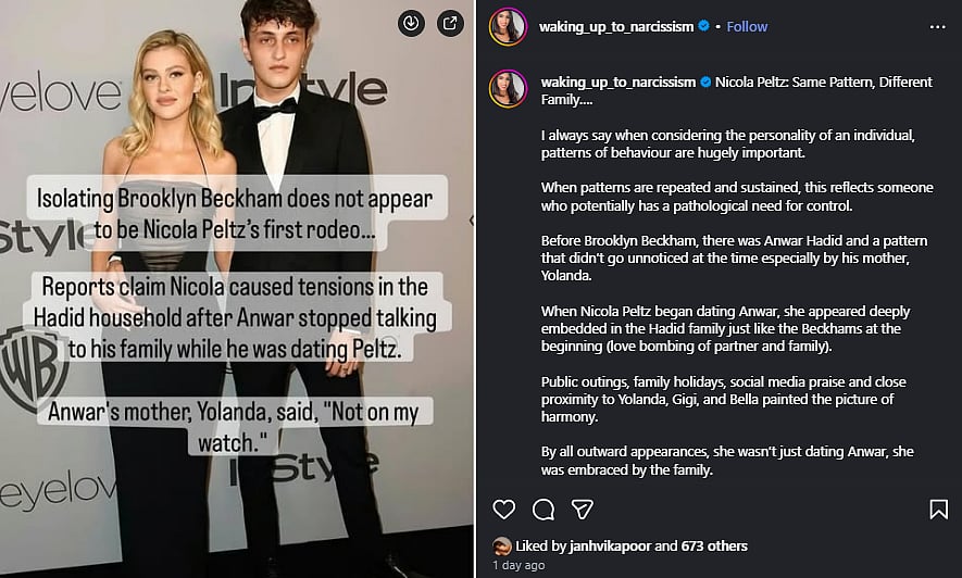 An Instagram page called Waking Up To Narcissism wrote, "Before Brooklyn Beckham, there was Anwar Hadid and a pattern that didnโt go unnoticed at the time especially by his mother, Yolanda. When Nicola Peltz began dating Anwar, she appeared deeply embedded in the Hadid family just like the Beckhams at the beginning (love bombing of partner and family). Public outings, family holidays, social media praise and close proximity to Yolanda, Gigi, and Bella painted the picture of harmony."