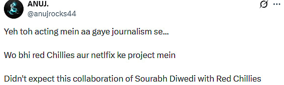 Another X user wrote, "Saurabh Dwivedi is new kusha kapila in b town (sic)." One more netizen tweeted, "Yeh toh acting mein aa gaye journalism se... Wo bhi red Chillies aur netlfix ke project mein. Didn't expect this collaboration of Sourabh Diwedi with Red Chillies (sic)." Check out the tweets below...