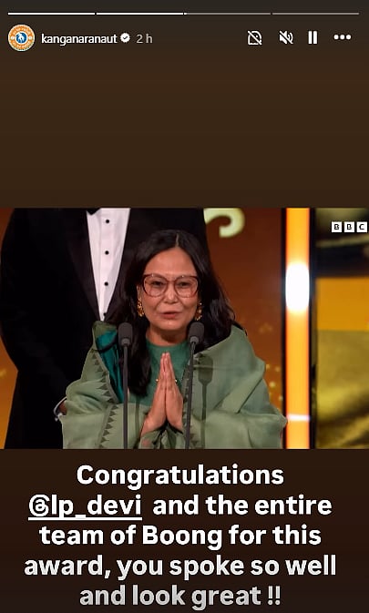 Taking to her Instagram stories on Monday (February 23), Kangana praised the filmmaker and her team. She wrote, "Congratulations @lp_devi and the entire team of Boong for this award, you spoke so well and look great."