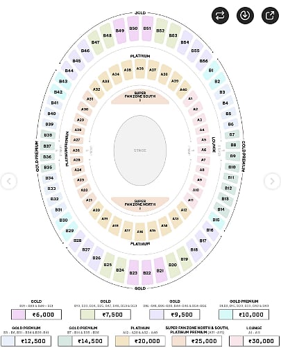 The ticket prices start at Rs 6,000, Rs 7,500, and Rs 9,500 for the Gold category, followed by Rs 10,000, Rs 12,500, and Rs 14,500 for the Gold Premium category. Platinum tickets are priced at Rs 20,000, while the Super Fan Zone category costs Rs 25,000.