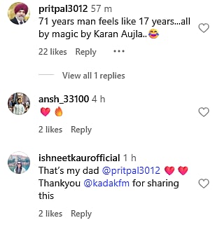 Netizens can't stop praising Karan for his gesture towards the fan. A netizen commented, "Fav artist.. so down to earth (sic)." The fan, who is actually dancing in the video, commented, "71 years man feels like 17 years...all by magic by Karan Aujla.. (sic)."