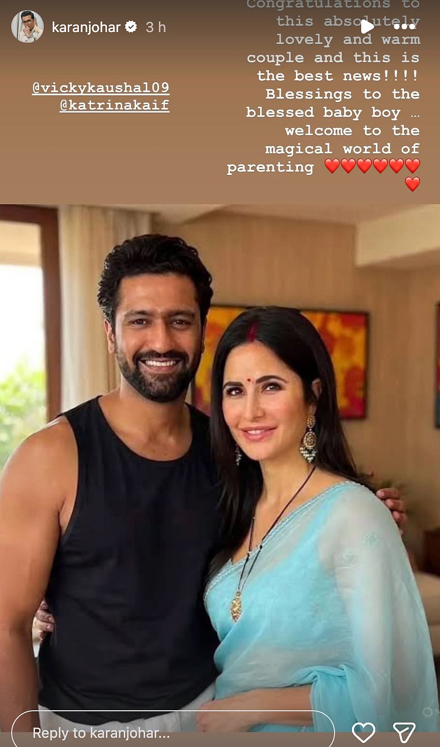 Filmmaker Karan Johar penned a heartfelt wish for new parents Katrina Kaif and Vicky Kaushal, who welcomed their first child, a baby boy, on Friday, November 7, but with a twist: he shared an AI-generated photo of the couple to accompany his message.