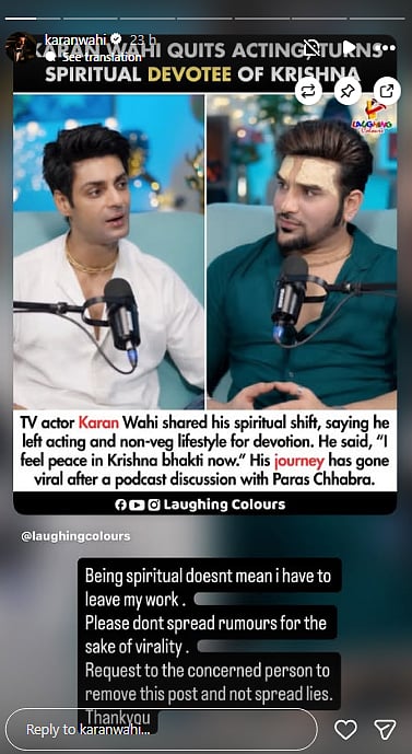 Actor Karan Wahi has addressed rumours claiming he has quit acting, after several social media posts misinterpreted his recent interview about his spiritual journey. The actor has now set the record straight, making it clear that he is very much continuing his work in the entertainment industry.