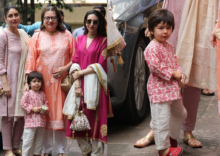 Kareena and Taimur headed to meet Karisma and Babita to celebrate Diwali at their office. The trio posed for the paps in a perfect family frame. Kareena wore a lilac salwar suit with her hair neatly tied in a bun. Karisma on the other hand opted for a dark pink suit, whereas Babita wore a peach kurta.