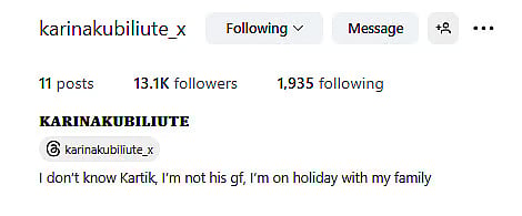 After the dating rumours surfaced, Karina, in her Instagram bio, mentioned, "I don’t know Kartik, I’m not his gf, I’m on holiday with my family." On Tuesday, she updated her bio which read, "I don’t know Kartik."