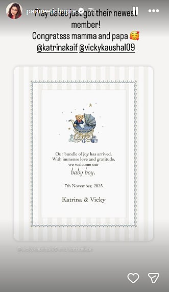 A few days ago, Parineeti Chopra was also blessed with a baby. She took to her Instagram story to congratulate Vicky and Katrina. The actress wrote, "Play dates just got their newest member! Congratsss mamma and papa (sic)."