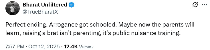 Another X user wrote, “Perfect ending. Arrogance got schooled. Maybe now the parents will learn, raising a brat isn’t parenting, it’s public nuisance training. (sic).”