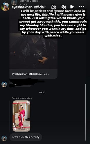 The Instagram user, identified as Snehal Gamit, replied to her story saying, "Let’s f*ck this beauty." Ayesha did not hold back — she exposed his identity and slammed him, saying, "I will be patient and ignore these men in the next life; this life mostly, I will give it back. Just letting the world know, you cannot ruin my Monday like this, you have no right to say whatever you want in my DMs, and go by your day with peace while you mess with mine."