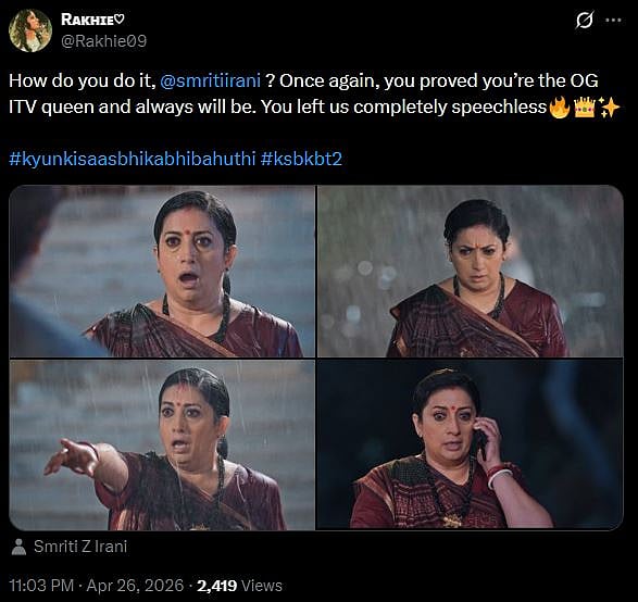 A netizen tweeted, "I’m still trying to process that how does Ekta manage to do it every freaking time? Yeh zyada hi KRAAAAZY nahi ho gaya (sic)." Another X user wrote, "How do you do it, @smritiirani? Once again, you proved you’re the OG ITV queen and always will be. You left us completely speechless (sic)."