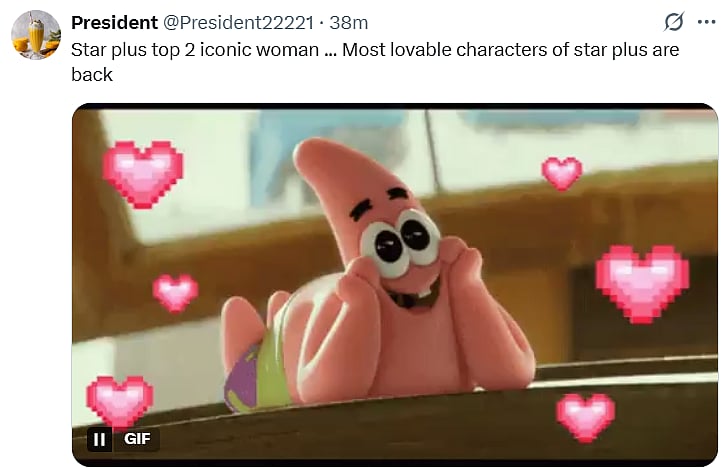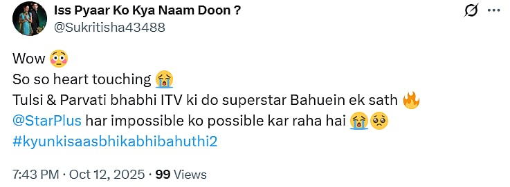 A netizen tweeted, “Wow 😳 So so heart touching 😭 Tulsi & Parvati bhabhi ITV ki do superstar Bahuein ek sath 🔥 @StarPlus har impossible ko possible kar raha hai (sic).” Another X user tweeted, “Star plus top 2 iconic woman ... Most lovable characters of star plus are back (sic).”