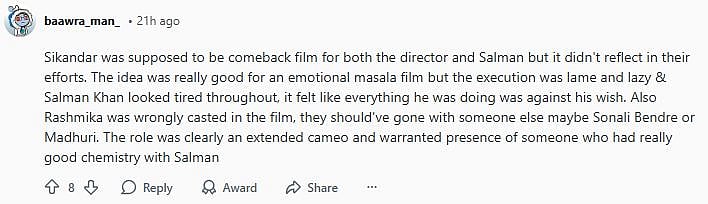 Rashmika's interview became the topic of discussion on Reddit. A netizen commented, "Nothing could have saved this disaster...Bhoi's acting was lazy and he seemed so disinterested as if he was being forced at gunpoint to do his job like they grabbed him from bb set for shoots and they were looking like a father daughter pair on top of that along with that horrible remake of lagg jaa gale this film was doomed from the beginning (sic)."