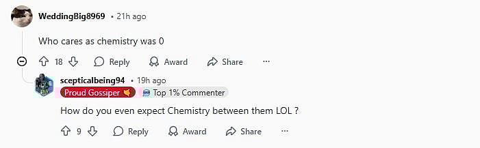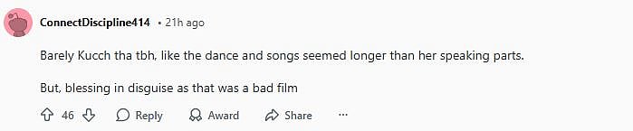 Another Reddit user wrote, "Barely Kucch tha tbh, like the dance and songs seemed longer than her speaking parts (sic)." One more netizen commented, "Who cares as chemistry was 0 (sic)." Check out the comments below...