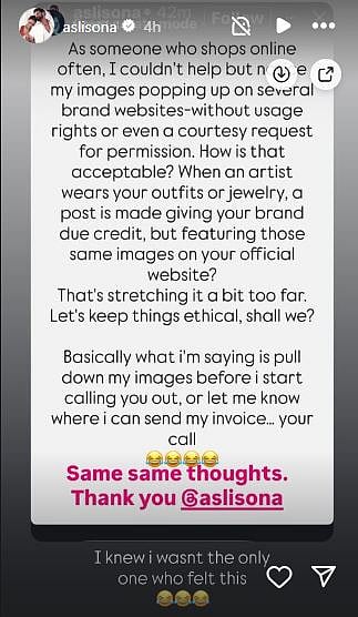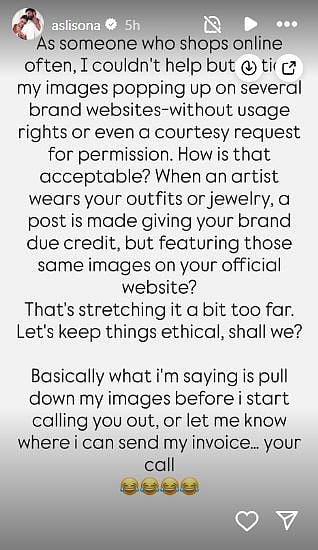 She further wrote, "Let's keep things ethical, shall we Basically what i'm saying is pull down my images before i start calling you out, or let me know where i can send my invoice... your call (sic)." Check out the post below...