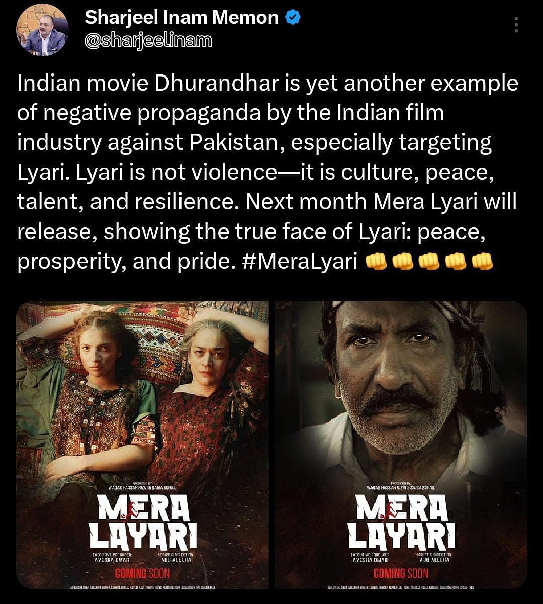 Sindh Information Minister Sharjeel Inam Memon shared Mera Layari's posters on X and wrote, "Indian movie Dhurandhar is yet another example of negative propaganda by the Indian film industry against Pakistan, especially targeting Lyari. Lyari is not violenceโit is culture, peace, talent, and resilience. Next month Mera Lyari will release, showing the true face of Lyari: peace, prosperity, and pride. #MeraLyari."A