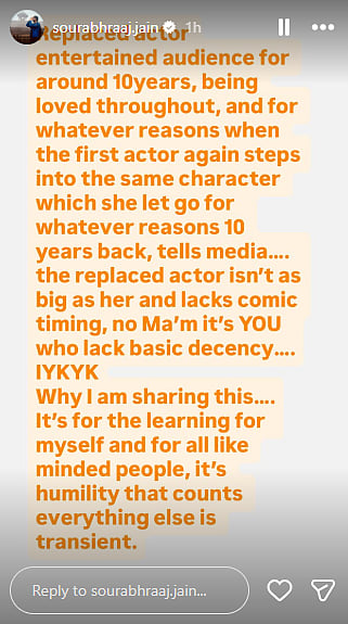 Sourabh wrote, "Replaced actor entertained audience for around 10years, being loved throughout, and for whatever reasons when the first actor again steps into the same character which she let go for whatever reasons 10 years back, tells media.... the replaced actor isn't as big as her and lacks comic timing, no Ma'm it's YOU who lack basic decency.... IYKYK (sic)."