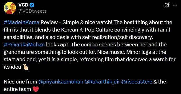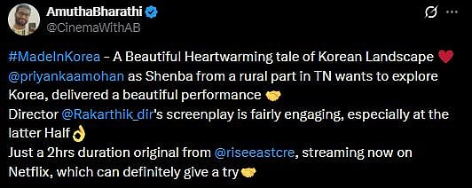 One more netizen tweeted, "#MadeInKorea - A Beautiful Heartwarming tale of Korean Landscape ♥️ @priyankaamohan as Shenba from a rural part in TN wants to explore Korea, delivered a beautiful performance 🤝 Director @Rakarthik_dir 's screenplay is fairly engaging, especially at the latter Half👌 Just a 2hrs duration original from @riseeastcre , streaming now on Netflix, which can definitely give a try (sic)." Check out the tweets below...