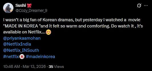 A netizen tweeted, "I wasn’t a big fan of Korean dramas, but yesterday I watched a movie MADE IN KOREA and it felt so warm and comforting. Do watch it , it’s available on Netflix.... (sic)."