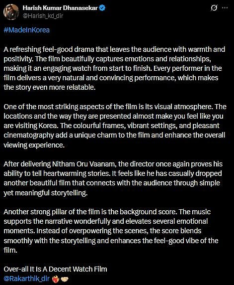Another X user wrote, "#MadeInKorea - Needed more K-Drama! A straight-fwd film that has neat setup & some heartwarming moments clicking but writing is very baseline for emotions to really land & things just pass by from one point to another... Fine for timepass! Pretty good perf from PAM 👍 AVERAGE (sic)."