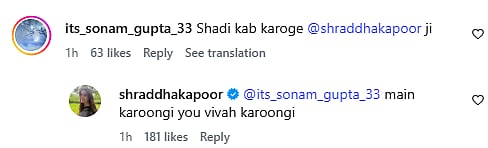 The fan commented on the post, "Shadi kab karoge @shraddhakapoor ji. To this, the actress replied, "Main karoongi you vivah karoongi (sic)." Check out the comment below...