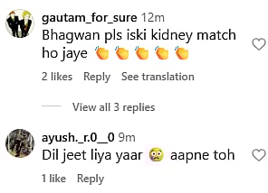 Another Instagram user wrote, "Bhagwan pls iski kidney match ho jaye (sic)." One more fan commented, "Dil jeet liya yaar 😢 aapne toh (sic)." Check out the comments below...
