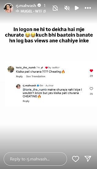 Reacting to the troll, Mahvash shared on her Instagram story, "In logon ne hi to dekha hai mje churate kuch bhi baatein banate hn log bas views ane chahiye inke (sic)." She also replied to the troll in the comments and wrote, "Maine churaya nahi islye I wouldn't know but yes kisika pati churana CHEATING (sic)." Check out the post below...