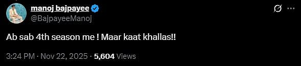 When an X user tweeted, "Bro, I double-checked… even triple checked. Where is Episode 8 in The Family Man S3 (sic)." So, Bajpayee replied, "Ab sab 4th season me ! Maar kaat khallas!! (sic)."