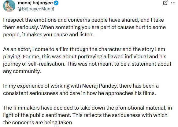 On X (Twitter), Bajpayee tweeted, "I respect the emotions and concerns people have shared, and I take them seriously. When something you are part of causes hurt to some people, it makes you pause and listen. As an actor, I come to a film through the character and the story I am playing. For me, this was about portraying a flawed individual and his journey of self-realisation. This was not meant to be a statement about any community."